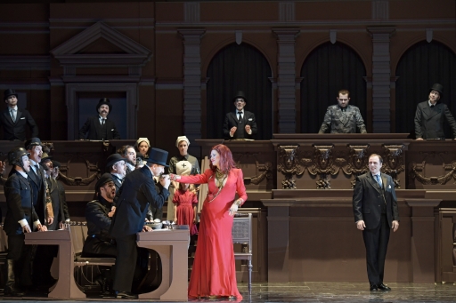 (Oedipus Rex): Tanja Ariane Baumgartner (Jokaste; im roten Kleid), Peter Marsh (Ödipus; rechts) und Gary Griffiths (Kreon; dahinter) sowie Ensemble . Copyright: Barbara Aumüller