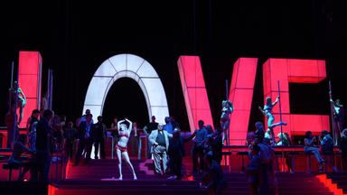 Dass Regisseur Alex Ollé von der katalanischen Gruppe Fura dels Baus ‚Manon Lescaut‘, erstes Hauptwerk Puccinis, in die heutige Zeit versetzen würde, davon war auszugehen. Daß er das langfristige Scheitern einer Liebe par excellance so fulminant mit aktuell-brisanten politischen Vorgängen verquickt auf die Bühne hievt, verlangt Respekt. Nach Puccini, dem Librettisten Illica und dem zugrundeliegenden Roman von Abbe Prevost soll das Mädchen Manon in ein Kloster verbracht werden, was früher ja häufig vorkam, heute aber nicht mehr. Als Konsequenz wurde in der Neuinszenierung der Grund für die Flucht zweier junger Verliebter in dem Status der Geschwister als Flüchtlinge gesehen, und Manon, die jüngere, von ihrer Mutter in einem Brief dringend zur Rückkehr aus familiären Gründen aufgefordert. Das wird im Vorspann eines Videos (Emmanuel Carlier) geschildert, in dem auch Bilder vom Arbeitsplatz von Mutter und Tochter in einer Textilfabrik und von einem nächtlichen Fußmarsch der Flüchtlinge, bei der sie Zäune überqueren müssen, eingeblendet werden. Der Wirt in dem Gasthof, wo sie im Original landen, ist hier der ‚Registrator‘ der die ankommenden Flüchtlinge an einer Kasse registriert und ihr Gepäck in Verwahrung nimmt. Dann mischen sie sich in einem Boulevardcafé unter die Leute, und da passiert es, daß sich Manon in den Studenten Des Grieux verliebt. Ihr Bruder, der sich gleich daran gemacht hat, ihre Rückführung in die Wege zu leiten, und der Nachtclubbessitzer Geronte, der die Schöne mithilfe des Studenten Edmondo nach Paris lotsen will, werden beide getäuscht und überrumpelt durch die Flucht Des Grieux‘ mit Manon. Diese hält es aber mit dem armen Studenten nicht lange aus, es kommt doch noch Geronte mit seinem Nachtclub zum Zug, in dem Manon eine gefragte Tänzerin wird.Der Rest der Geschichte spielt sich dann mehr oder weniger wie im Original ab, wobei der 3.Akt, wo Manon im Gefängnis sitzt, aber in der Spannung nachläßt. Die Gitterkäfige ermöglichen wenig Einblick, so daß man die Prostituierten kaum sieht, vorne wird nur der scheiternde Befreiungsversuch von des Grieux und Lescaut in Szene gesetzt. Die Einschiffung bzw. Ausweisung per Flugzeug der Mädchen, sowie der hämisch kommentierende gute Chor, der aus dem Off singt, werden nicht gezeigt. Der 4.Akt spielt dann auf der leeren aber brisant ausgeleuchteten Bühne (Licht: Joachim Klein), und Manon placiert sich, während Grieux Wasser sucht, auf dem E von LOVE, dessen turmhohe Buchstaben auf der Drehbühne auch in den vorhergehenden Akten das Bühnenbild von Alfons Flores prägten. Die Kostüme sind natürlich authentisch heutig, wie sie auch die Flüchtlinge tragen, im 2.vertauscht Manon Jogginghose mit goldenen Samttops und Minis, während die tutti-Stangentänzerinnen aber in schwarzen Bikinis im gnädigem Dunkel auftreten (Kostüme: Lluc Castells).