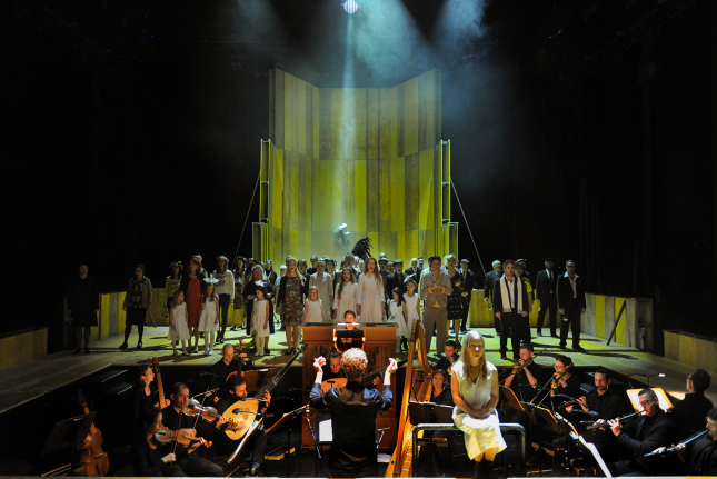 Die Choristen treten in bunt zusammengewürfelten dörflichen Kostümen auf (Anna Eiermann), eine stumme Maria kauert vor dem Orchester, ein Dorftrottel umtänzelt den nach vorne kommenden Chor und zerschnipselt Gesangbuchseiten. In der hinteren Apsis tollt ein schwarzer Priester mit einem lädierten Flügel mit kleinen weißgewandeten Mädchen mit Friedenstauben auf den Köpfen herum, läßt sie hochfliegen und verteilt Süßigkeiten. Eine etwas ältere Frau in scharlachrotem Gewand könnte Anna, die Mutter Marias sein, die Anstalten zur späten Geburt ihrer Tochter macht. Das Gebären erscheint überhaupt ein wichtiges Thema in Bieitos Interpretation, viele Kinderpuppen werden ans Licht gebracht, mit denen dann die realen Kinder spielen, final zeigt der Regisseur aber einmal nicht die Geburt der Maria (Simone Becherer), deren Körper, von Kirchenmännern(!) gehalten, unter der weißen Tunika heftig zuckt und ihr ein verklärtes Lächeln aufs Gesicht zaubert. Dabei strahlt auch weißes gleißendes Licht in den Raum (Nicole Berry).