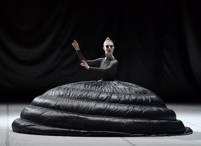 Der Reihe nach: Douglas Lee hatte bereits während seiner Tänzeraktivität in Stuttgart als Choreograph mit technisch hoch anspruchsvollen Arbeiten neoklassischer Prägung in dunkel düsteren Stimmungsbildern von sich reden gemacht. Daran hat sich nichts wesentlich geändert, wie seine nun nach 9jähriger Abwesenheit entstandene „NAIAD“ beweist. Hinzugekommen ist allenfalls eine feinere Symbiose mit dem musikalischen Material, was bei einem für seine sonstige Musikauswahl doch recht melodiös geführten Doppel aus „Algal Bloom“ (=Algenblüte) von Joby Talbot und der Auftragskomposition „Corallina“ von Nicolas Saáva auch einigermaßen leichter fällt. Die beiden Musiktitel sind denn auch ein Hinweis auf die Thematik des Stückes. Inspiriert vom Gedicht „Der Krake“ von Alfred Lord Tenysson und fasziniert von den gegensätzlichen Kräfte-Auswirkungen von Wasser zwischen Heilung und Zerstörung wirft Lee einen Blick ins Unterwassergeschehen. Dreh- und senkbare Scheinwerfer schaffen wechselnde Lichtverhältnisse und evozieren Auf- und Abbewegungen des Wassers. Außerdem werden Wellenbewegungen durch einen den Hintergrund einnehmenden schwarzen Plastikvorhang hergestellt. Aus demselben Material ist auch das Kostüm, ein aufgeblasen wirkendes Ballonkleid der als erzählerischer Leitfaden über die Bühne gleitenden und schreitenden Najade, die anfangs und am Ende mit Verstärkung flüsternd einige Worte aus dem erwähnten Gedicht wie ein geheimnisvolles Echo des Meeres von sich gibt. Wie eine Riesenqualle nimmt sie immer wieder andere Formen an, unterschützt von fließenden Arm-Ausrichtungen der wie in einem Kokon steckenden Tänzerin Sinéad Brodd. Zweifellos die markanteste Figur in dieser Meereswelt, deren sonstige Elemente sich in kleinen Soli, Duos und wechselnden Gruppen in einem unaufhörliche in alle Richtungen strebenden, durchaus fließenden Stil bewegen. Da im Titel des einen Musikstückes von Korallen die Rede ist, hätte der optischen Ausrichtung durchaus die eine oder andere Farbe mehr angestanden, als nur dunkelgrüne Hosen und schwarze Oberteile (Bühne + Kostüme: Eva Adler). Doch wahrscheinlich spielte der Umweltgedanke eines fortschreitend zugemüllten und bedrohten Meeres eine größere Rolle als dessen schillernde Farbspektren. Verläuft die Choreographie alternierend zum eher gemessenen, transparent geführten Dialog zwischen einer Solovioline (Gustavo Surgik), Klavier und Orchester betont ruhig, nimmt sie im zweiten Teil die lautere und schnellere Gangart auf. Außer einigen rasant ausbrechenden Momenten sticht kaum etwas heraus., so dass auch die 10 TänzerInnen, angeführt von den Ersten Solistinnen Elisa Badenes und Ami Morita sowie den Solisten Agnes Su und Marti Fernandez Paixa vorwiegend als kleines homogenes Ensemble für sich einnehmen. Großer anerkennender Applaus für den Rückkehrer.