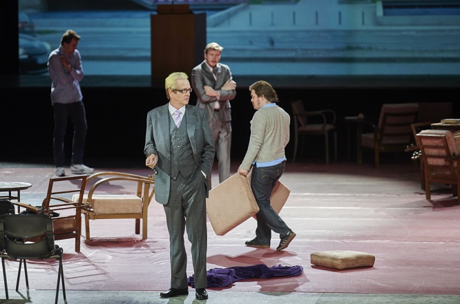 Im Bühnenbild und den fantasievollen Kostümen von Anna Viebrock spielen Jossi Wieler und Sergio Morabito hier mit fantasievollen Metaphern. Der im zweiten Weltkrieg zerstörte Raum lebt wieder auf. Das hat auch etwas Melancholisches, das sich auf die Aufführung überträgt. Es ist ein Theater auf dem Theater. Die Inszenierung arbeitet aber auch die Überlebensmöglichkeiten und Fluchtmöglichkeiten aus dem Gefängnis der eigenen Psyche sehr deutlich heraus. Darin besitzt sie ihre besondere Stärke und ihren hohen künstlerischen Wert. Überhaupt gibt es in dieser Produktion nur ganz wenige szenische Schwächen. Dies betrifft die Umbauphase, die man vielleicht noch etwas mystischer hätte umsetzen können. Und doch gibt es auch hier einen roten Faden – nämlich den berühmten mythologischen „Faden der Ariadne“. Dies zeigt sich vor allem dann, wenn der Raum unter der Regie des von TV-Talkmaster Harald Schmidt humorvoll gemimten Haushofmeisters schließlich total verändert wird. Ariadne und Zerbinetta spiegeln sich selbst, es entstehen unterschiedliche Hälften der Persönlichkeit im Rahmen der raffinierten Selbstbespiegelung. Dann verändern sich plötzlich die Hausfassaden – im Hintergrund nimmt man in einem Videofilm die Konrad-Adenauer-Straße vor dem Kammertheater und der Staatsgalerie in Stuttgart wahr. Enttäuschte Künstler übernehmen hier die Bestuhlung – sechzehn beschäftigungslose Sänger sind auf der Suche nach einer Oper. Sie reagieren mit Zynismus und Selbsthass auf ihre schwierige Situation. Das Vorspiel wird so zum Endspiel. In dem Stück wird die Ariadne-Oper eines jungen Komponisten demontiert.