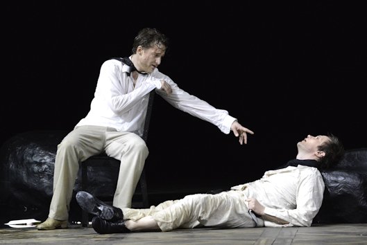 Der Abend ist schon an die drei Stunden alt, bevor die Männer – bis dahin drei weiß gekleidete Gestalten (Kostüme: Françoise Clavel), die Mary umkreisen – endlich zu ihren „Arien“ kommen. Dann darf (Wiederkehrer) Sven-Eric Bechtolf die Tragödie und die Monomanien des James Tyrone ausspielen (einer, der in der Kindheit so arm war, dass er als reicher Mann zum Geizhals wurde, einer, der seine Schauspieler-Ambitionen geopfert hat, um mit einer schlechten Rolle reich zu werden). Dann darf August Diehl ganz wunderbar den jüngeren Sohn spielen, der O’Neill selbst nachgestaltet ist – krank, eine Dichterseele, liebend und hassend, verstehend und aufbegehrend.