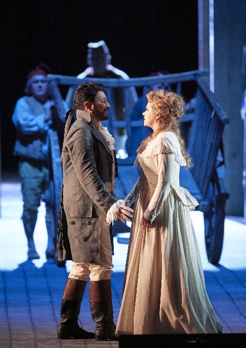 Ebenso ergriffen von dieser Arie zeigt sich in der dritten Vorstellung der derzeit laufenden Aufführungsserie der Verismo-Oper Andrea Chenier auch Carlo Gérard, der zum Revolutionär mutierte ehemalige Kammerdiener. George Petean besticht bei seinem Rollendebüt mit seinem wohlklingenden Bariton und erhält für seine berührend vorgetragene Arie „Nemico della patria“ zu Recht starken Applaus. Man spürt: Die Partie des Carlo Gérard ist geradezu ideal für diesen kultivierten Sänger. Denn Gérard ist nicht einer der baritonalen Bösewichte wie Scarpia oder Don Pizarro, sondern ein von großen politischen Idealen und sozialen Utopien bewegter Mann, der sich den dunklen Seiten seines Wesens stellt, mit ihnen kämpft und sie letztlich überwindet. Wie er im ersten Akt aus Verzweiflung, gepaart mit der großen Hoffnung auf eine Veränderung der gesellschaftlichen Verhältnisse, die Dienerlivree seiner Dienstherrin, der Gräfin di Coigny, vor die Füße wirft, ist ebenso glaubhaft wie sein Gesinnungswechsel angesichts des harten Schicksals der Tochter der Gräfin in den Wirren der Revolution. Es ist nicht ohne Grund Gérard, dem Giordanos Librettist, Luigi Illica, die berühmten Worte von der Revolution, die ihre Kinder frisst, in den Mund legt.