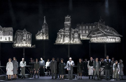 Aber der Erfolg des Abends geht auch auf das Konto von Keith Warner, denn ihm ist in Union mit seinem Ausstatter David Fielding eine wirklich hoch intelligente Inszenierung gelungen, wie man sie nicht alle Tage sieht. Sie half auch dem zweiten Teil des Abends, der etwas an Spannung verliert und gelegentlich durchhängt, über die Runden – bis zum großen Erfolg (und mit dem Buh-Rufer, der offenbar den Regisseur meinte, würde man gerne diskutieren, was er hier einzuwenden hatte). Wenn man zuerst nach Güllen kommt, kreieren Warner und Fielding eine graue, stumpfe Welt – wenige Versatzstücke, viele gemalte Hintergründe, die in Form von alten Postkarten herabgesenkt werden, ein Mini-Eisenbahnzug, die Menschen im Look der fünfziger Jahre. Güllen hat sich aufgegeben.