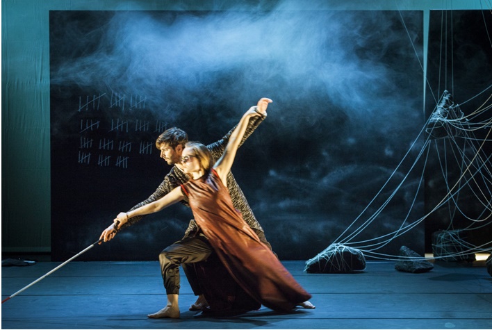 Homers „Odyssee“ wenigstens in Grundzügen zu kennen oder bruchstückhaft zu erinnern ist hilfreich, aber nicht zwingend notwendig zum Verständnis des Stückes. Nikolaus Adler prüft die Gesänge Eins bis Elf des Teiles Eins der Sage auf den Gehalt ihrer Bildsprache, um mit vier TänzerInnen, Katharina Illnar, Laura Fischer, Etienne Aweh und Chris Wang, allesamt exzellent agierend, eine Geschichte von Selbsterkenntnis und Selbstermächtigung zu erzählen. Das „Roadmovie unseres Lebens“, wie Nikolaus Adler (bis 2007 war er Tänzer des Wiener Staatsopernballetts und seit 1995 kreiert er international prämierte Choreografien), es selbst nennt, spielen die Vier in wechselnden Rollen auf einer dunklen Bühne. Schon die im Hintergrund in einem Gewirr aus Seilen hängenden Steine beschreiben das, wovon der erste an die Rückwand projizierte Text „Vor Anbeginn der Zeit war Chaos“ und der hinein gefauchte Theaternebel ihrerseits berichten. Auch die nur mit einem Schriftzug auf dem Boden angedeutete 10-jährige Belagerung Trojas als Ausgangspunkt ist kräftige Metapher. Wann, aus welchem Grund und in welchem Zustand begibt der seelisch belagerte Mensch sich auf die Reise? Und mit welchem Ziel?
